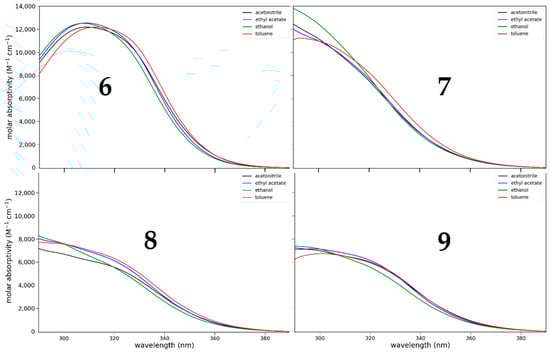 Compounds 6–9 show moderate absorption (log ε = 4) around 310 nm (Figure 5). Only ketone 6 shows a discrete maximum, while for the others the band is a shoulder. The absorption was determined in a range of solvents of different polarity and proticity: acetonitrile (dielectric constant (εr) = 37.5, aprotic), ethyl acetate (εr = 6.0, aprotic), ethanol (εr = 24.5, protic), toluene (εr = 2.4, aprotic). The absorption shows little dependence on the nature of the solvent.