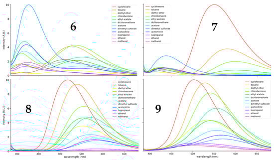 Fluorescence spectra of 1.1 × 10−4 M 6 (top left), 2.1 × 10−4 M 7 (top right), 8.0 × 10−5 M 8 (bottom left), and 1.3 × 10−4 M 9 (bottom right) in cyclohexane (—), toluene (—), diethyl ether (—), chlorobenzene (—), ethyl acetate (—), dichloromethane (—), acetone (—), dimethylsulfoxide (—), acetonitrile (—), isopropanol (—), ethanol (—), and methanol (—). Excitation at 366 nm.