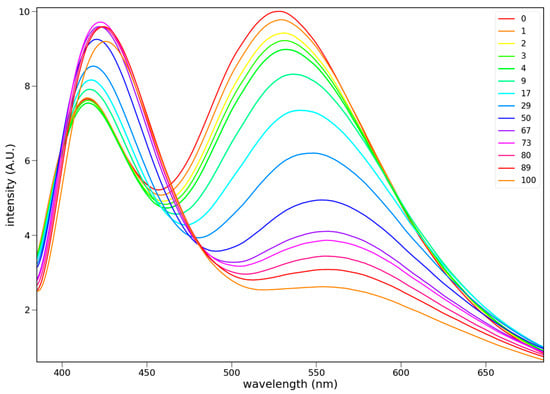 Fluorescence spectra of 1.1 × 10−4 M 6 in mixtures of toluene and acetonitrile. The acetonitrile mole % is indicated in the upper right.