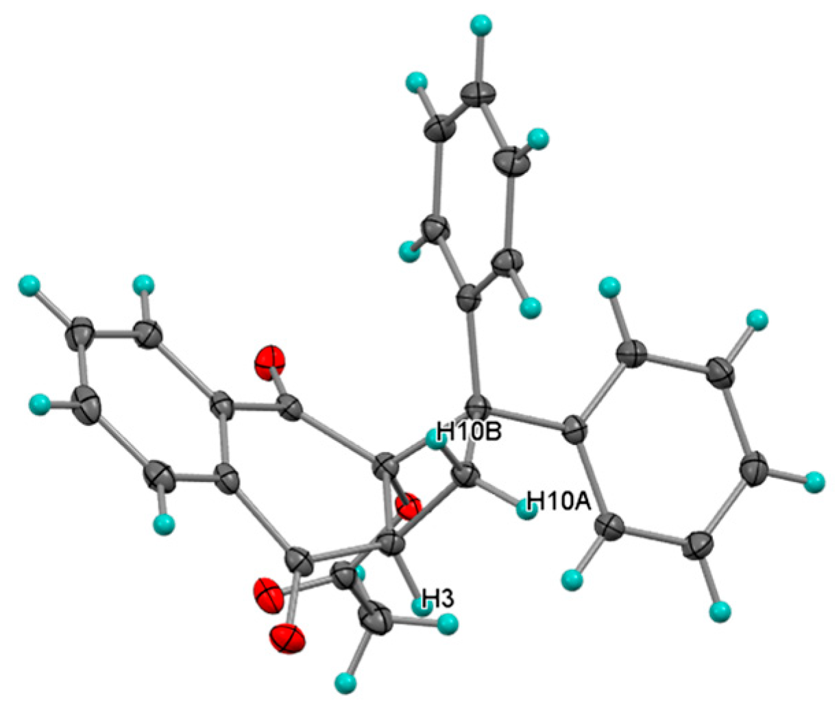 - Covell, C.; Gilbert, A.; Richter, C. Sunlight-induced Regio-and Stereo-specific (2π + 2π) Cycloaddition of Arylethenes to 2-Substituted-1, 4-naphthoquinones. J. Chem. Res. (S) 1998, 316–317. [Google Scholar] [CrossRef]
