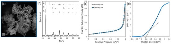 TiO2 P25 powder characterization: (a) SEM image; (b) XRD diffractogram (the reflection positions and relative intensities of Anatase (A), Brookite (B), and Rutile (R) phases are reported at the top, for comparison); (c) N2 adsorption/desorption isotherm at 77 K; and (d) Tauc plot of the diffuse reflectance spectrum.