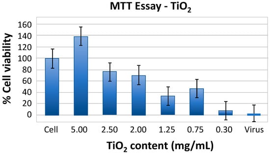 A comparative study of the effect of TiO2 at different concentrations on Nodavirus in the dark and under UV irradiation was performed to determine the mechanisms of the inactivating effect of TiO2. The investigation of the cytopathic effect was also carried out. The MTT assay shows that the cell viability decreases after the addition of TiO2 at different concentrations, especially in the 2.5–0.3 mg/mL range. These results are consistent with those of previous studies [51], showing a significant reduction in cell viability upon co-exposure of the BF2 fish cell line to TiO2 at 2.5 and 1.25 g/L. Despite the fact that the MTT assay either overestimates the cell viability or fails to detect a reduction in cell number and viability, this effect is most likely produced by the superoxide anions (•O2−) generated by TiO2 NPs [52].