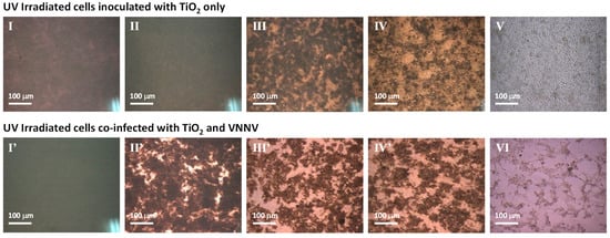 Cytopathic effect of different concentrations of TiO2 after 60 min UV irradiation, without (I–IV) or with (I′–IV′) Nodavirus infection. TiO2 concentration: (I,I′) 5 mg/mL; (II,II′) 2.5 mg/mL; (III,III′): 1.25 mg/mL; (IV,IV′) 0.3 mg/mL; compared to (V) water only and (VI) Nodavirus only. Scale bar = 100 μm.