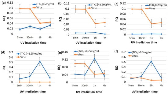 Effect of UV-irradiation time on the relative expression of the viral gene CP after inoculation with different concentrations of TiO2: (a) 5 mg/mL; (b) 2.5 mg/mL; (c): 2 mg/mL; (d): 1.25 mg/mL; (e): 0.75 mg/mL; and (f) 0.3 mg/mL.