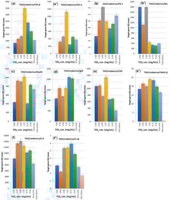 Effect of the TiO2 content (from 5.0 to 0.3 mg/mL) co-incubated with Nodavirus and under UV irradiation on immune genes expression profiles, compared to virus only and cell culture. (a,a′) Anti-inflammatory gene; (b,b′) antiviral protein genes; (c) stress gene; (d) gene involved in humoral response; (e,e′) genes involved in cellular response; and (f,f′) pro-inflammatory genes.