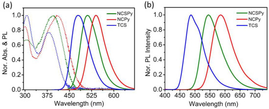 In the PL spectra, the compounds in toluene exhibit one main emission band, with the maximum of emission (λPL) at 511 nm, 539 nm, and 479 nm for NCSPy, NCPy, and TCS, respectively. The intense absorption and strong PL emission of these compounds in diluted solution suggest the potential occurrence of intramolecular charge transfer (ICT) during the photon excitation and relaxation process [32,33]. The relative fluorescence quantum yields (Φ) of NCSPy and TCS are 0.34 and 0.48 in Tol, respectively, while that of NCPy is only 0.10. When the solvent is changed to THF, the Φ of all these compounds decrease.