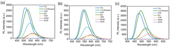 PL spectra of NCSPy (a), NCPy (b), TCS (c) in various organic solvents (Tol = toluene, ChF = trichloromethane, EA = ethyl acetate, THF = tetrahydrofuran, DCM = dichloromethane, ACN = acetonitrile).
