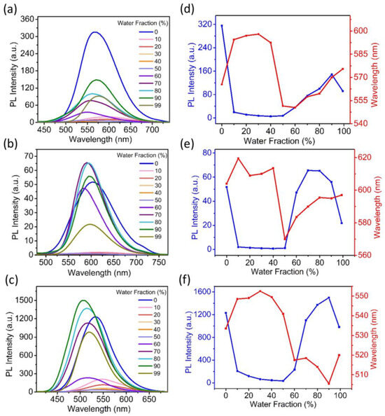The PL spectra of NCSPy (a), NCPy (b), and TCS (c) in THF/H2O mixed solvents with different H2O fractions; (d–f) the corresponding PL shifts and intensity changes as the increase of H2O fractions in THF/H2O mixed solvents.