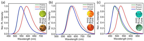 Piezochromic properties of NCSPy (a), NCPy (b), and TCS (c) upon mechanical grinding and after vapor fuming.