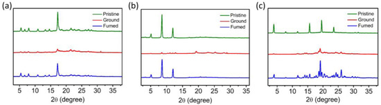 Powder XRD patterns of the aggregates in a pristine state (blue line), upon grinding (red line), and after vapor exposure: (a) NCSPy, (b) NCPy, and (c) TCS.