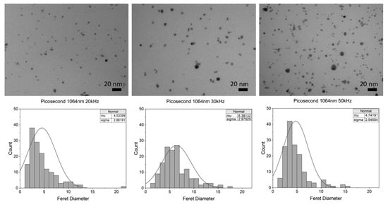 TEM images and size distribution graphs of AuNPs synthesized using the picosecond pulse rate and 1064 nm wavelength at 20 kHz, 30 kHz, and 50 kHz frequencies.
