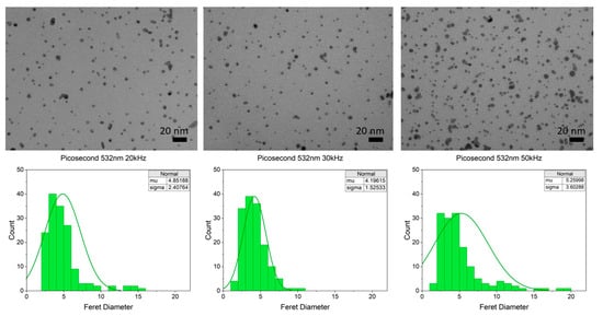 TEM images and size distribution graphs of AuNPs synthesized using the picosecond pulse rate and 532 nm wavelength at 20 kHz, 30 kHz, and 50 kHz frequencies.
