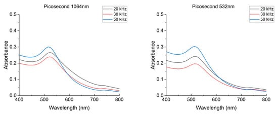 Figure 5 shows the UV–Visible spectra for the samples synthesized using the picosecond laser. The SPR wavelengths for each solution fell within the 516–520 nm range, again correlating with nanoparticles ranging from 5 to 10 nm in diameter [60,64]. Additionally, the absorbances of the samples produced using the picosecond laser at both the 1064 nm and 532 nm wavelengths confirmed the approximate nanoparticle concentrations observed in the TEM images. For both wavelengths, the 50 kHz frequency produced the highest particle yield, followed by the 20 kHz frequency, and then the 30 kHz frequency.