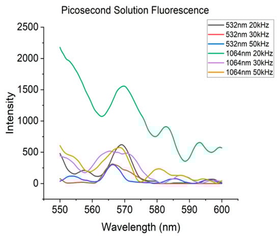 Fluorescence spectra for AuNP solutions obtained using picosecond laser with 1064 and 532 nm wavelengths at various powers and frequencies at 518 nm excitation wavelength.