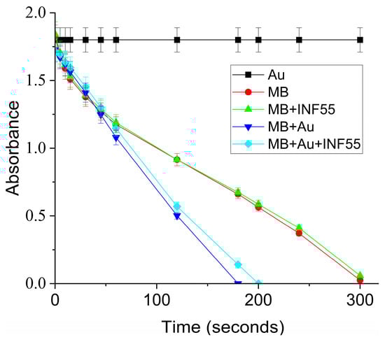 Experimental solutions were prepared by combining the desired reagents, including MB (10−6 M), AuNPs, and INF-55 with 100 µL of a 2.4 mM ABMDMA solution in a 1.5 mL cuvette. The total volume was brought to a standard 1 mL using phosphate-buffer solution (PBS). The initial absorbance was measured, and each cuvette was placed under irradiation for the allotted time. After irradiation, the absorbance was measured to verify the production of ROS. All ROS measurements were performed using n = 4 independent biological replicates. Error bars in the corresponding figures represent the standard deviation (SD) from these replicates.