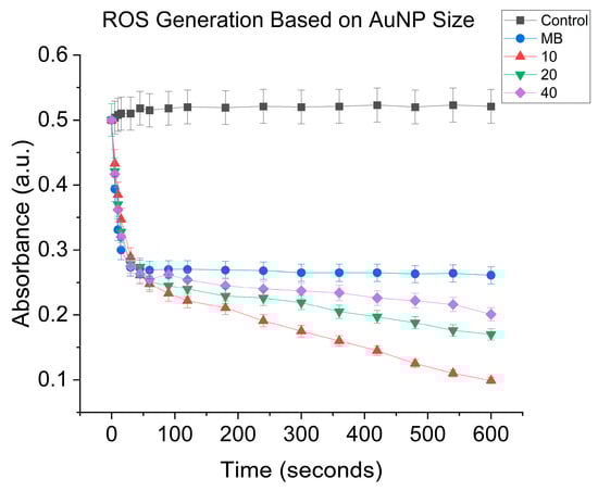 To verify and quantify the production of reactive oxygen species by the excitation of methylene blue in combination with AuNPs, the compound 9,10-Anthracenediyl-bis(methylene)dimalonic Acid (ABMDMA) was used in a colorimetric assay. ABMDMA has a peak absorbance at 400 nm. When in the presence of reactive oxygen species, ABMDMA undergoes a 2+4 cycloaddition of oxygen to form an endoperoxide. This cycloaddition results in a loss of the aromatic π-system of electrons leading to photobleaching of the optically observable properties [59,60]. Therefore, the absorbance of the solution directly corresponds to the ROS generated in solution.