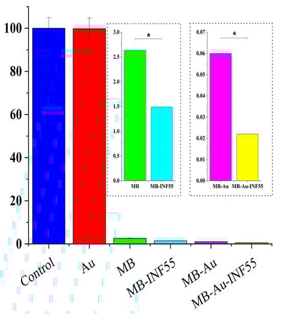 Synergistic effect of Au (10 nm) nanoparticles and INF-55 in photodynamic bacterial inactivation at 6 min. Insets show lower concentrations in detail. Independent samples t-test revealed a statistically significant (*) difference between MB and MB-INF55 (p < 0.05) and between MB-Au and MB-Au-INF55 (p < 0.05).