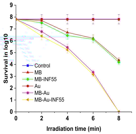 When INF-55 was combined with MB or MB/AuNPs, however, the photodeactivation rate of bacteria increased substantially, as shown in Figure 9. At 6 min of irradiation, INF-55 enhanced bacterial killing by ~43% when combined with MB, while the combination of INF-55 with MB/AuNPs yielded nearly a 59% reduction compared to MB/AuNPs alone. These results strongly suggest that INF-55, an efflux pump inhibitor, facilitates intracellular retention of MB and/or AuNP complexes, thereby amplifying ROS-mediated bacterial killing. The antimicrobial properties of gold nanoparticles are less pronounced than silver, but they possess unique photophysical properties that make them particularly relevant for PDT. AuNPs can enhance singlet oxygen production through plasmon resonance and light scattering, thereby amplifying MB’s photodynamic effect.