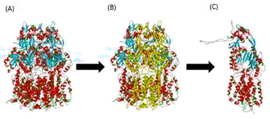 Efflux pumps are a key target for overcoming resistance and improving PDT efficiency [44,45,46,47]. The efflux pump targeted in this work is the AcrAB-TolC complex found within the membrane of the Gram-negative bacteria Escherichia coli (E. coli), the structure of which is depicted in Figure 2 [48,49,50].