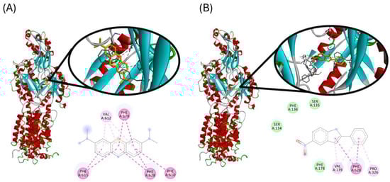 Molecular docking was performed to predict the binding affinity and interaction stability of INF-55 within the AcrB drug-binding pocket, enabling us to evaluate whether INF-55 can effectively compete with MB and function as an efflux pump inhibitor using Autodock Vina as described in the Section 2.