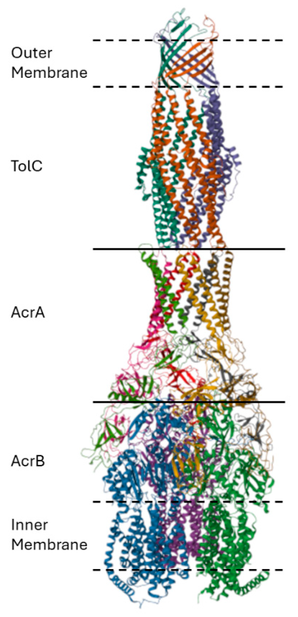 47]. The efflux pump targeted in this work is the AcrAB-TolC complex found within the membrane of the Gram-negative bacteria Escherichia coli (