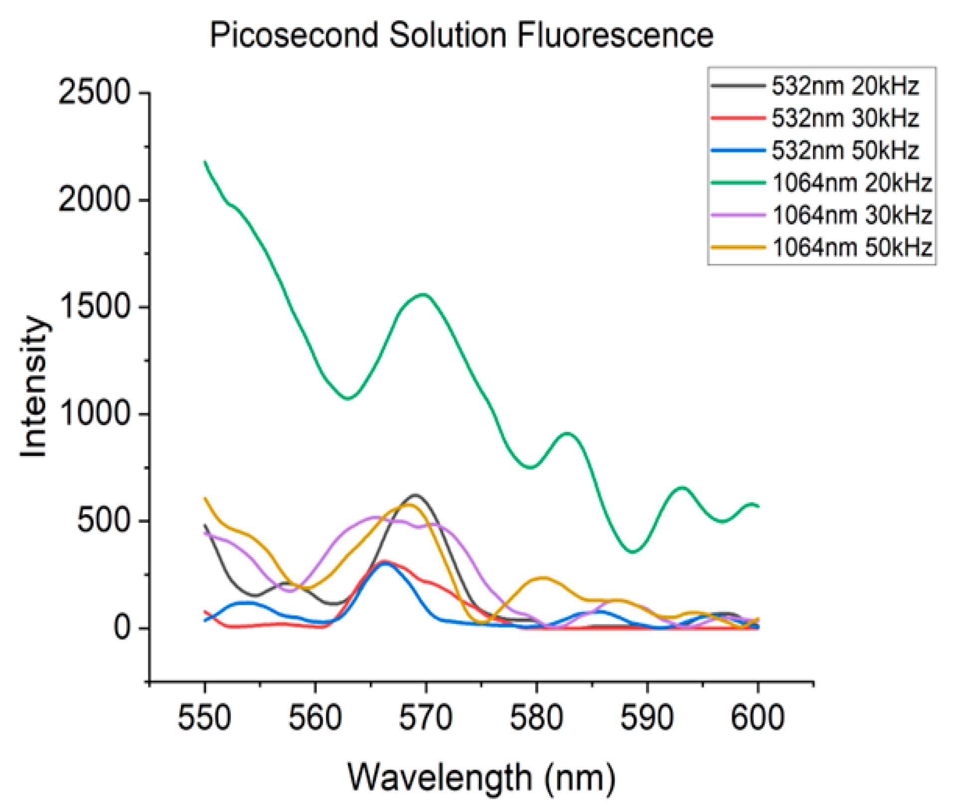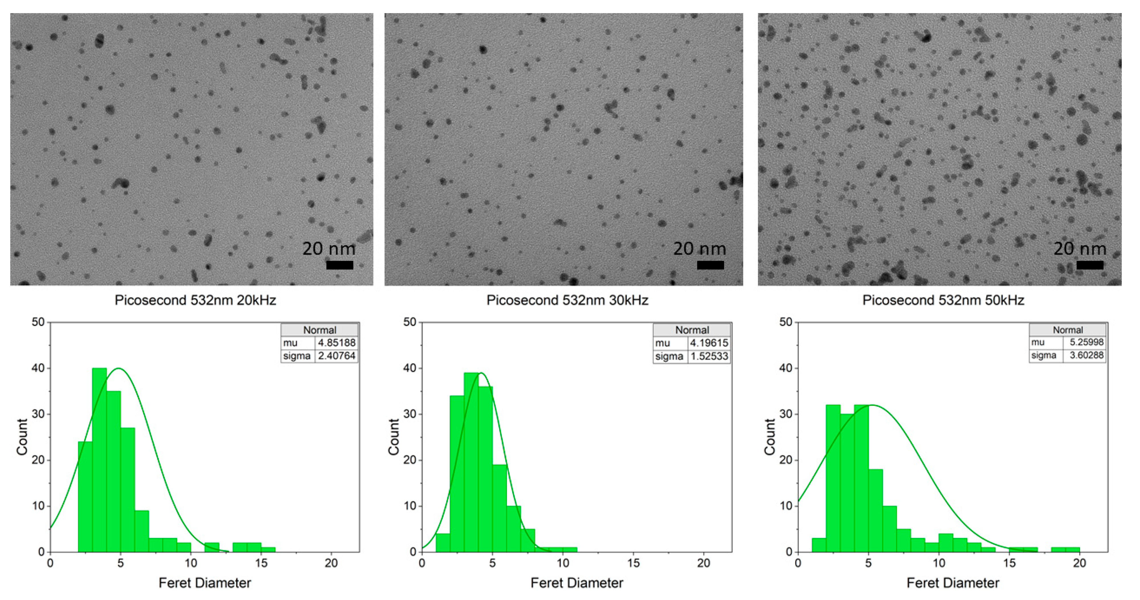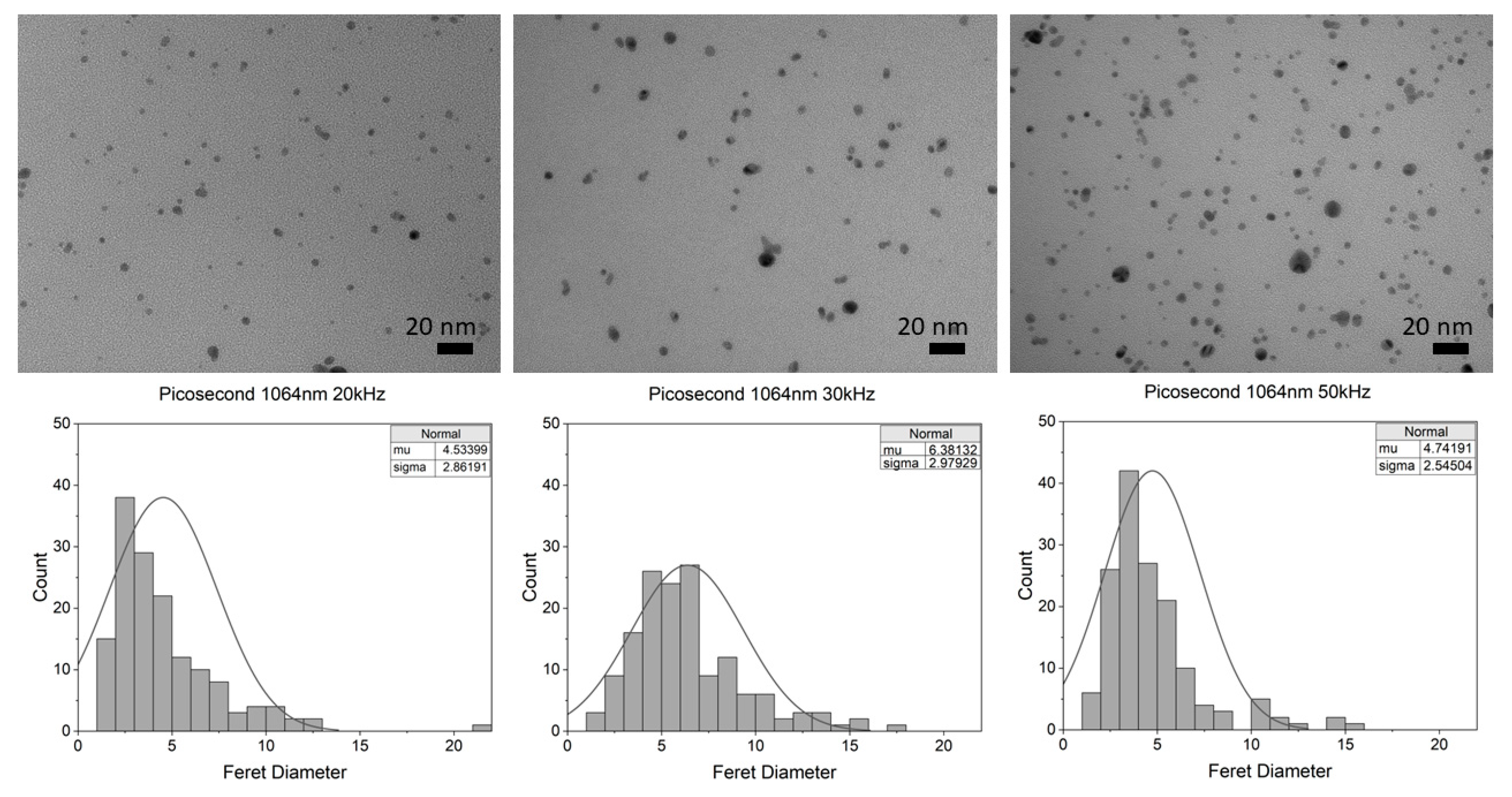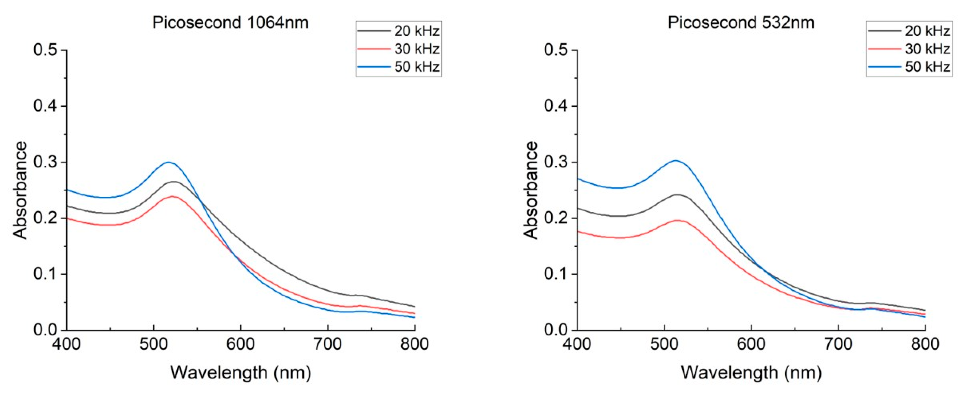 64]. Additionally, the absorbances of the samples produced using the picosecond laser at both the 1064 nm and 532 nm wavelengths confirmed the approximate nanoparticle concentrations observed in the TEM images. For both wavelengths, the 50 kHz frequency produced the highest particle yield, followed by the 20 kHz frequency, and then the 30 kHz frequency.