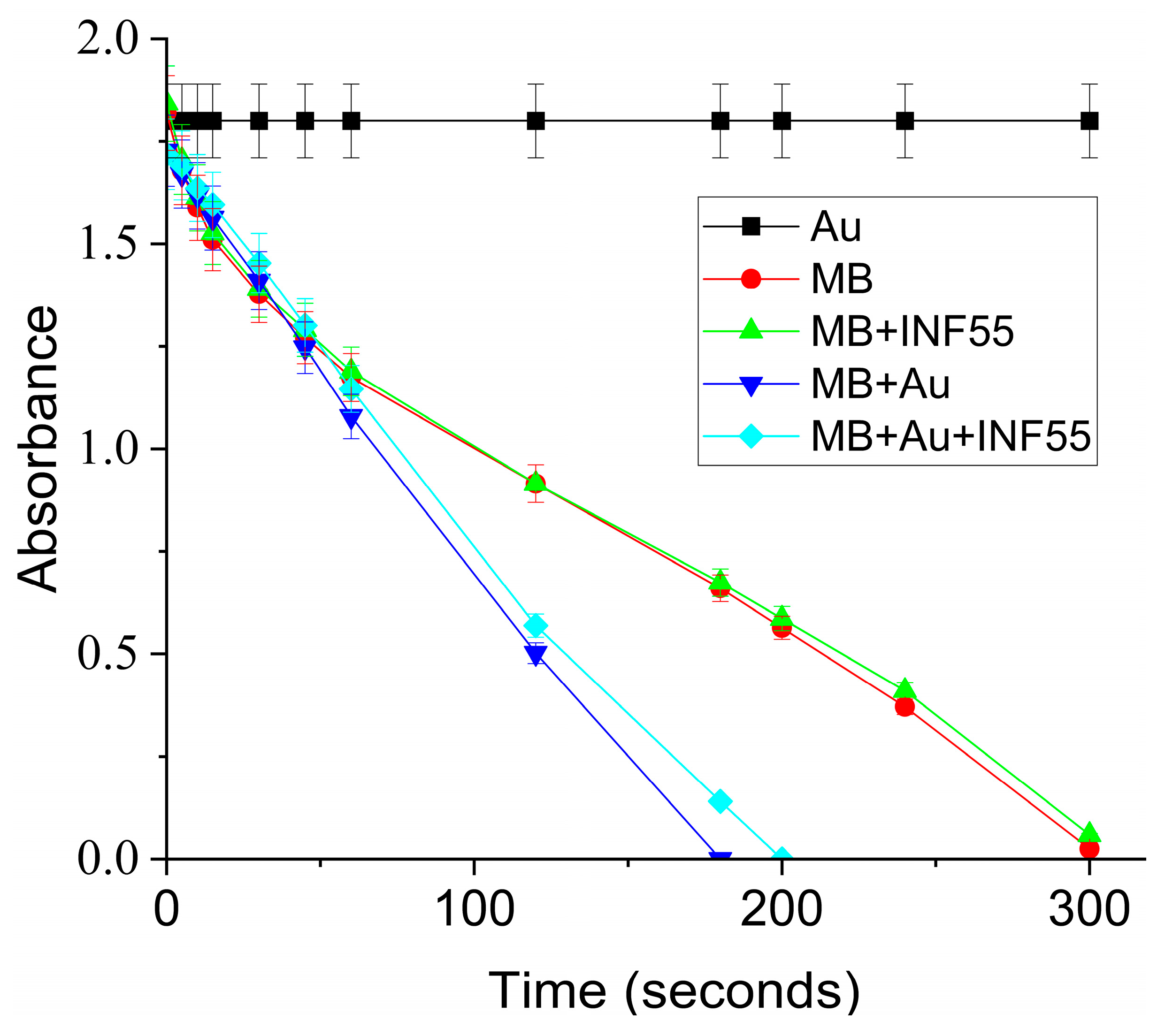 Figure 7 illustrates the optical density decay at 400 nm as an indicator of singlet oxygen generation in different conditions. For MB alone, the decay profile remains essentially unchanged with the addition of INF, demonstrating that INF does not directly alter the intrinsic photophysical properties of MB. In contrast, MB combined with AuNPs exhibits a markedly steeper decline, consistent with enhanced singlet oxygen production due to plasmonic interactions between AuNPs and MB. Specifically, the MB + Au sample shows a complete reduction in optical density to nearly zero after approximately 175 s of irradiation, while the MB + Au + INF condition reaches baseline slightly later, at around 200 s. The MB + INF curve overlaps closely with MB alone, confirming the lack of direct singlet oxygen generation from INF. Both curves decrease to zero around 300 s. The AuNP-only sample maintains a constant OD throughout, indicating negligible photobleaching or ROS generation in the absence of MB. These results collectively highlight the synergistic enhancement of photodynamic activity through AuNP-mediated plasmonic coupling and INF-assisted efflux inhibition.