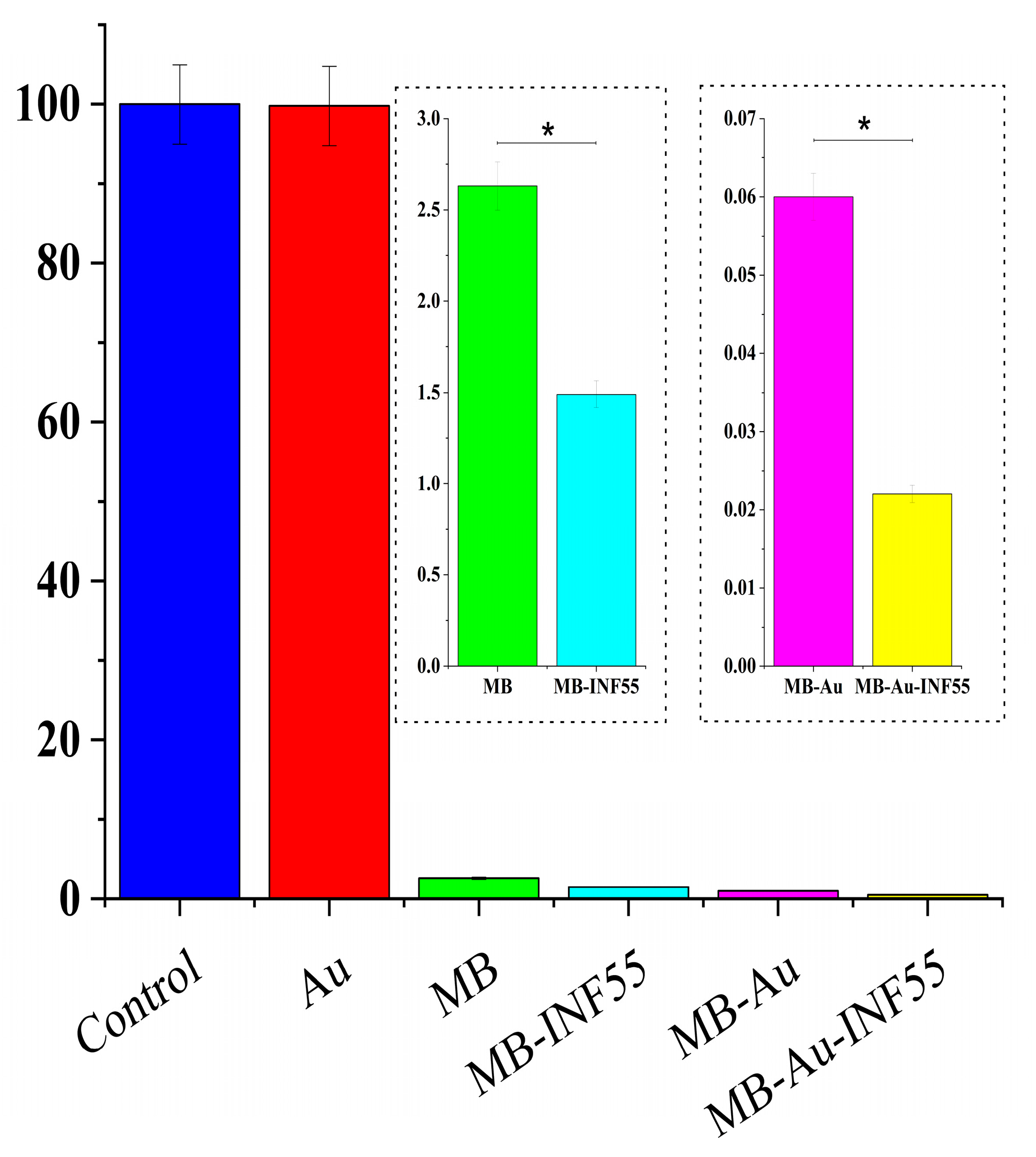Figure 11). Consistent with previous findings, smaller AuNPs demonstrated stronger PDT enhancement due to their higher surface area-to-volume ratio and increased intracellular uptake. However, unlike the case for MB/AuNPs alone, no clear size-dependent trend emerged for INF-55’s enhancement. INF-55 produced measurable reductions in CFU counts across all three AuNP sizes, with decreases of approximately 41% for 10 nm, 42% for 20 nm, and 47% for 40 nm AuNPs, respectively. Taken together, these results indicate that while smaller AuNPs intrinsically augment MB’s photodynamic efficiency, the potentiating role of INF-55 is consistent across particle sizes.