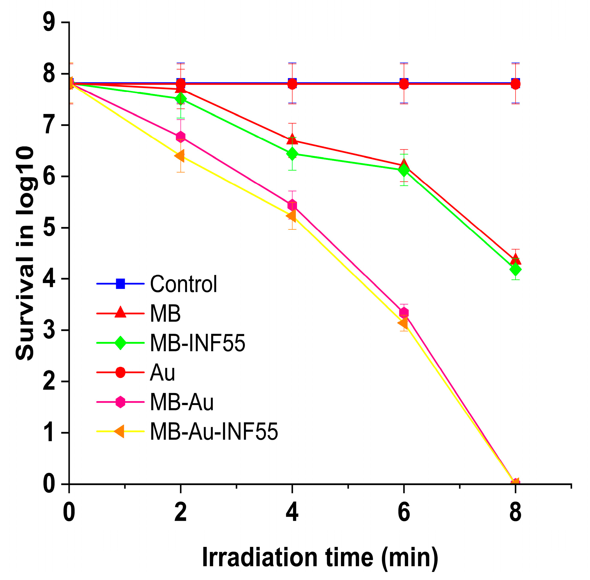 Figure 9. At 6 min of irradiation, INF-55 enhanced bacterial killing by ~43% when combined with MB, while the combination of INF-55 with MB/AuNPs yielded nearly a 59% reduction compared to MB/AuNPs alone. These results strongly suggest that INF-55, an efflux pump inhibitor, facilitates intracellular retention of MB and/or AuNP complexes, thereby amplifying ROS-mediated bacterial killing. The antimicrobial properties of gold nanoparticles are less pronounced than silver, but they possess unique photophysical properties that make them particularly relevant for PDT. AuNPs can enhance singlet oxygen production through plasmon resonance and light scattering, thereby amplifying MB’s photodynamic effect.