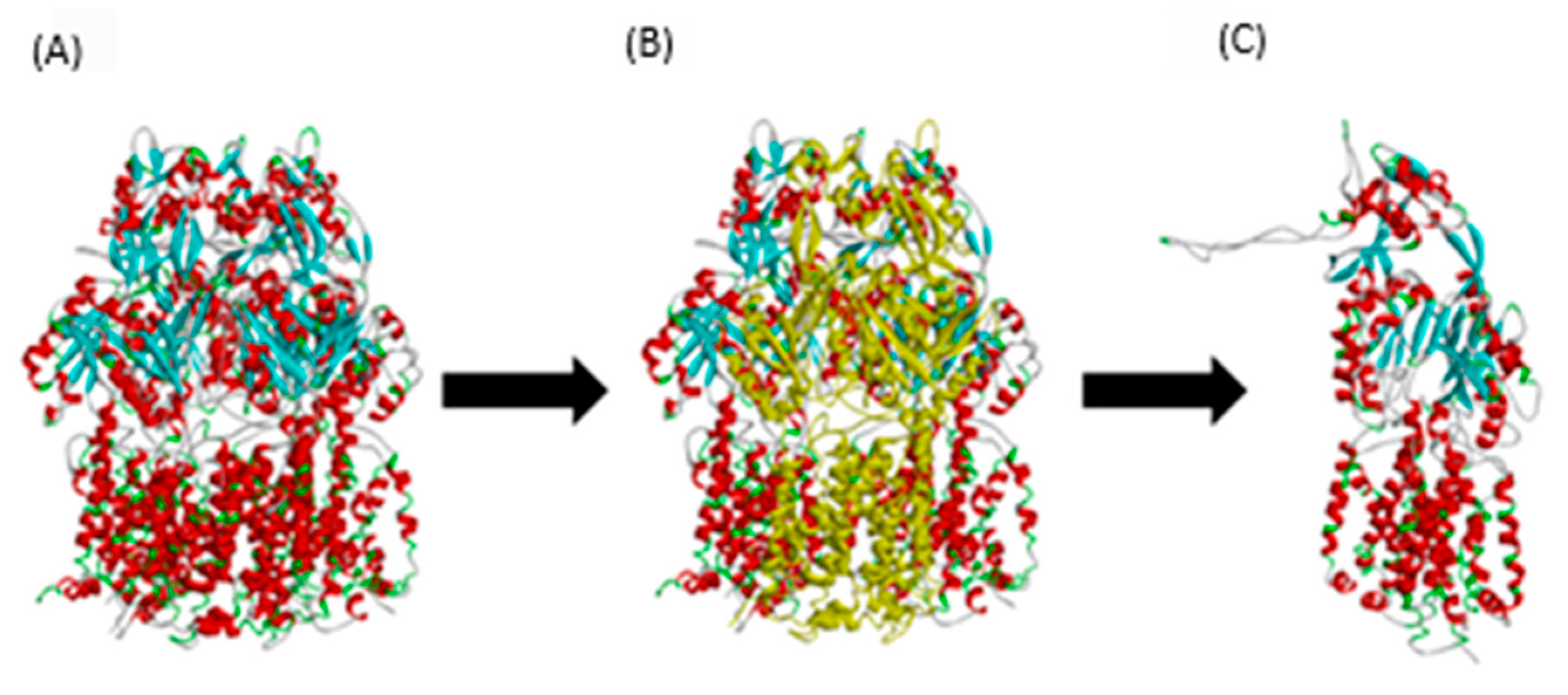 47]. As the AcrB is a homotrimeric antiporter, a single polypeptide unit was isolated for the docking calculations. The overall structure of the AcrB subunit and the isolation of the polypeptide unit is represented in