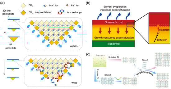 Furthermore, the evolution of crystal morphology is determined by the relative growth rates of different crystallographic faces, which can be selectively modulated by external directors. In the context of 2D perovskites, the introduction of specific additives or the control of intermediate phases can create such a directing environment. As illustrated in Figure 5a, the incorporation of Rb+ ions serve as a powerful template [60]. These ions adsorb onto specific crystal surfaces, retarding their growth kinetics. This selective retardation favors the rapid vertical growth of perovskite crystals along the (111) direction, effectively guiding the overall film orientation from its earliest stages. Most significantly, the critical role of chemically derived intermediates as inherent templates has been clearly demonstrated. As revealed in Figure 5c, two distinct Cl-related intermediates serve as structural templates that directly direct the orientational growth of the 2D perovskite films [61]. These coordinated intermediates, with their specific chemical composition and pre-organized structure, act as internal templates that steer the crystallization pathway toward a uniformly oriented morphology, effectively suppressing the formation of randomly oriented grains.