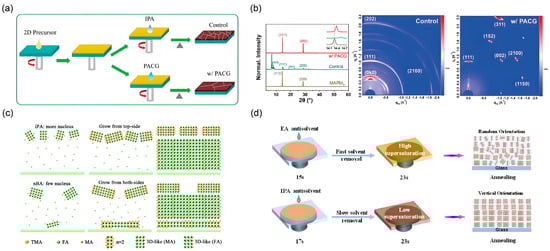 Antisolvent treatment is widely employed in high-performance three-dimensional PSCs [63,64]. This technique has also proven highly effective in achieving vertically oriented 2D perovskite films. The process entails the rapid introduction of a poor solvent during spin-coating, prompting immediate solvent extraction and triggering fast nucleation. In the study by Dong et al., a precursor-assisted crystal growth (PACG) technique was developed using isopropanol (IPA) as the antisolvent medium [31]. As illustrated in Figure 7a, a dilute IPA solution containing ThFAI, MAI, and MACI in the same ratio as the precursor was applied as the antisolvent during spin-coating. This method promoted heterogeneous nucleation and vertical growth, yielding a compact, large-grained, and highly oriented (ThFA)2MA2Pb3I10 film, in stark contrast to the rough and randomly oriented morphology obtained with pure IPA antisolvent. Structural characterization underscores the advantages of the PACG method. XRD and GIWAXS patterns in Figure 7b reveal that the PACG-processed film exhibits enhanced diffraction peak intensities and a higher (202)/(111) intensity ratio, indicating improved crystallinity and preferential vertical orientation of the inorganic slabs. The GIWAXS pattern shows sharp Bragg spots, confirming a highly oriented structure, whereas the control film displays polycrystalline rings indicative of random orientation.