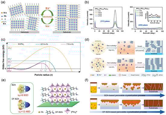 The molecular structure of the organic spacer is a critical determinant for directing crystal orientation. As illustrated in Figure 10e, the introduction of fluorine atoms into the benzylamine-based spacer, creating 3,5-difluorobenzylamine (DF-BZA), imposes a distinct template effect compared to its non-fluorinated counterpart (BZA) [68]. This fluorination strategy not only enhances the molecular dipole moment from 8.90 D in BZA to 12.48 D in DF-BZA but also promotes a stronger interaction with the inorganic lattice. Consequently, the DF-BZA spacer more effectively induces the crystallization of the quasi-2D perovskite with a vertical orientation, as depicted in the crystal structure schematic. This molecular-level control directly governs the crystallization pathway from solution to solid film. Figure 10f schematically compares the crystallization processes mediated by BZA and DF-BZA. The DF-BZA-based precursor solution features larger colloidal aggregates, which serve as superior nucleation sites. These low-energy nucleation centers template the subsequent growth of a dense and uniformly oriented perovskite film with a preferential vertical alignment of the inorganic slabs. In contrast, the BZA spacer, forming smaller aggregates, leads to a less controlled nucleation and growth process, resulting in a film with more random crystal orientation and inferior coverage.