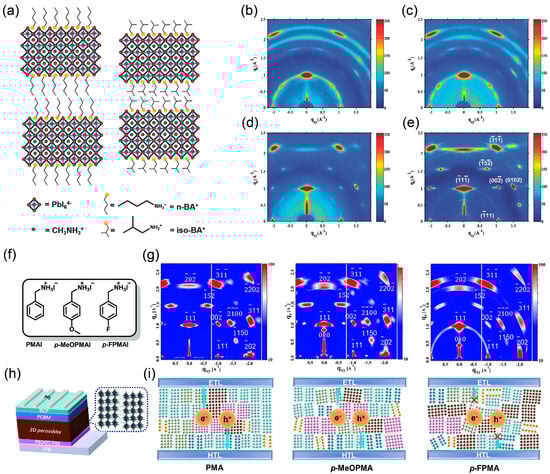 Building upon the discussion of the relationship between spacer molecular nucleation pathways and crystal orientation, Chen et al. and Lai et al. systematically regulated the molecular configuration and electronic properties through rational functional group design, using simple BA and benzylamine (PMA) as molecular prototypes, thereby achieving highly oriented growth of 2D RP perovskites [42,69]. As illustrated in Figure 11a, taking linear n-BA and branched-chain iso-BA as examples, subtle differences in their molecular structures significantly influence crystal stacking behavior: the branched-chain iso-BA, due to its steric hindrance and superior molecular packing ability, promotes a reduction in the interlayer spacing of inorganic slabs, enhances crystallinity, and induces preferential out-of-plane crystal growth. GIWAXS results (Figure 11b–e) further confirm that iso-BA-based perovskites, whether prepared at room temperature or via hot-casting, exhibit distinct Bragg spots, indicating a highly ordered vertical crystal alignment. In contrast, linear n-BA-based samples show continuous diffraction rings, suggesting random crystal orientation.