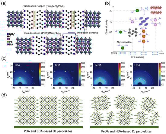 Schematic illustrations and structural characterization of DJ phase 2D perovskites. (a) 2D RP (PA)2(MA)3Pb4I13 and DJ (PDA)(MA)3Pb4I13. Reprinted from Ref. [43], Copyright (2019) Elsevier. (b) The correlation between perovskite dimensionality and the extent of π–π stacking interactions between aromatic diammonium spacers. Reprinted from Ref. [72], Copyright (2024) American Chemical Society. (c,d) GIWAXS patterns and corresponding schematic models depicting the crystal orientation and phase distribution in DJ-phase perovskite films prepared with PDA, BDA, PeDA, and HDA spacer cations. Reprinted from Ref. [73], Copyright (2019) Wiley.
