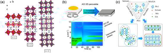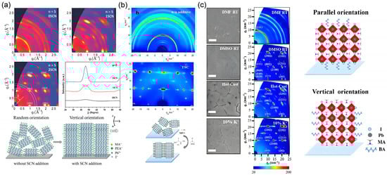 The n-value, which represents the number of inorganic layer sheets in the perovskite quantum well, can be tuned by adjusting the stoichiometric ratio of the precursor components. Since quasi-2D perovskites exhibit a multi-quantum well structure, the distribution of different n-value phases in the film is inherently accompanied by inconsistent orientation [16,65]. Taking (BA)2(MA)n−1PbnI3n+1 as an example, the transition from 3D to 2D structure involves the partial substitution of methylammonium ions by larger organic cations. When n = 1, MA is completely replaced by BA, resulting in a fully parallel crystal orientation relative to the substrate, and the bandgap shifts from 1.52 eV for MAPbI3 (n = ∞) to 2.24 eV for BA2PbI4 (n = 1). Cao et al. demonstrated that high-quality, smooth, and fully covered films with vertical crystal growth can be achieved for n = 3 and 4 phases via a one-step spin-coating method [16]. While 2D halide perovskites generally favor in-plane growth of inorganic layers on planar substrates [66], the orientation behavior varies with n. For n = 2, the coexistence of (111), (202), and (0k0) diffraction peaks indicates mixed vertical and parallel orientations. In contrast, only (111) and (202) reflections are present for n = 3 and 4, indicating highly preferential out-of-plane orientation. This growth behavior can be attributed to the competitive interaction between the large BA cations, which restrict in-plane growth, and the small MA ions, which promote out-of-plane expansion, as illustrated in Figure 9a. Therefore, the orientation of (BA)2(MA)n−1PbnI3n+1 perovskite films is strongly governed by the value of n.