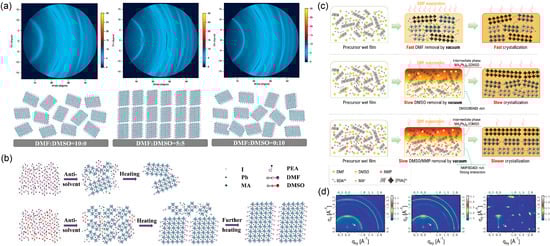 The origin and nature of these critical nuclei are further elucidated in recent studies. As depicted in Figure 4c, the nuclei of 2D perovskites can originate from dimethylformamide (DMF) intermediate complexes, such as (MA)PbI3·DMF, (MA)2x(BA)2(1−x)Pb3I8·2DMF, and (BA)PbI3·DMF [58]. These intermediates, which are formed during the sol–gel stage of film processing, can directly transform into 2D perovskite nuclei upon thermal annealing, provided sufficient organic ammonium salts are present to complete the conversion and avoid non-perovskite byproducts like PbI2. Complementing this, Figure 4d provides a striking comparison between two nucleation sources: conventional nucleation derived from the stochastic conversion of these solvent intermediates versus the use of pre-synthesized, phase-pure BA2MA3Pb3I10 “memory seeds” [57]. The GIWAXS patterns and schematics clearly demonstrate that films grown from pre-formed seeds exhibit a dramatically enhanced out-of-plane orientation compared to those formed via the conventional route. This collective evidence underscores that both the source and inherent structure of the crystalline nuclei, along with their nucleation site, critically govern the crystallographic orientation of the final film.