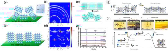 As illustrated in Figure 3d,e, Chen et al. provide a critical insight by demonstrating that nucleation occurring specifically at the liquid–air interface can lead to highly oriented films [53]. Their in situ characterization revealed the formation of a vertically oriented “top crust” at the solution surface, while the bulk beneath remained uncrystallized. This phenomenon indicates that the anisotropic environment of the liquid–air interface can promote the formation of nuclei with a specific orientation. The proposed model in Figure 3e suggests that this configuration, which allows the hydrophobic organic spacers to remain immersed in the solution, is energetically favorable, thereby defining the orientation for subsequent crystal growth.