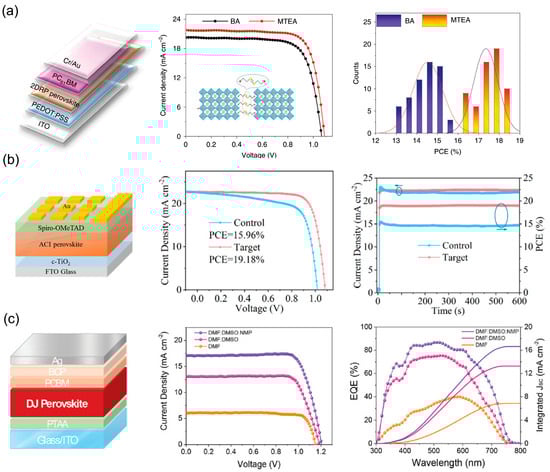 Molecular structure design was also extensively applied in 2D DJ perovskites. Zhao et al. employed an asymmetric alkyl diammonium cation, 3-(dimethylammonium)-1-propylammonium (DMAPA2+), as a spacer in n = 4 DJ perovskites [75]. The vertical crystal orientation of the thin film was primarily governed by the formation of a solvent-induced intermediate phase during the crystallization process. The formation and decomposition of the intermediate phase, combined with the structural suitability of the DMAPA2+ spacer, were found to collectively facilitate the transformation from the solvent-induced intermediate phase to the perovskite structure.