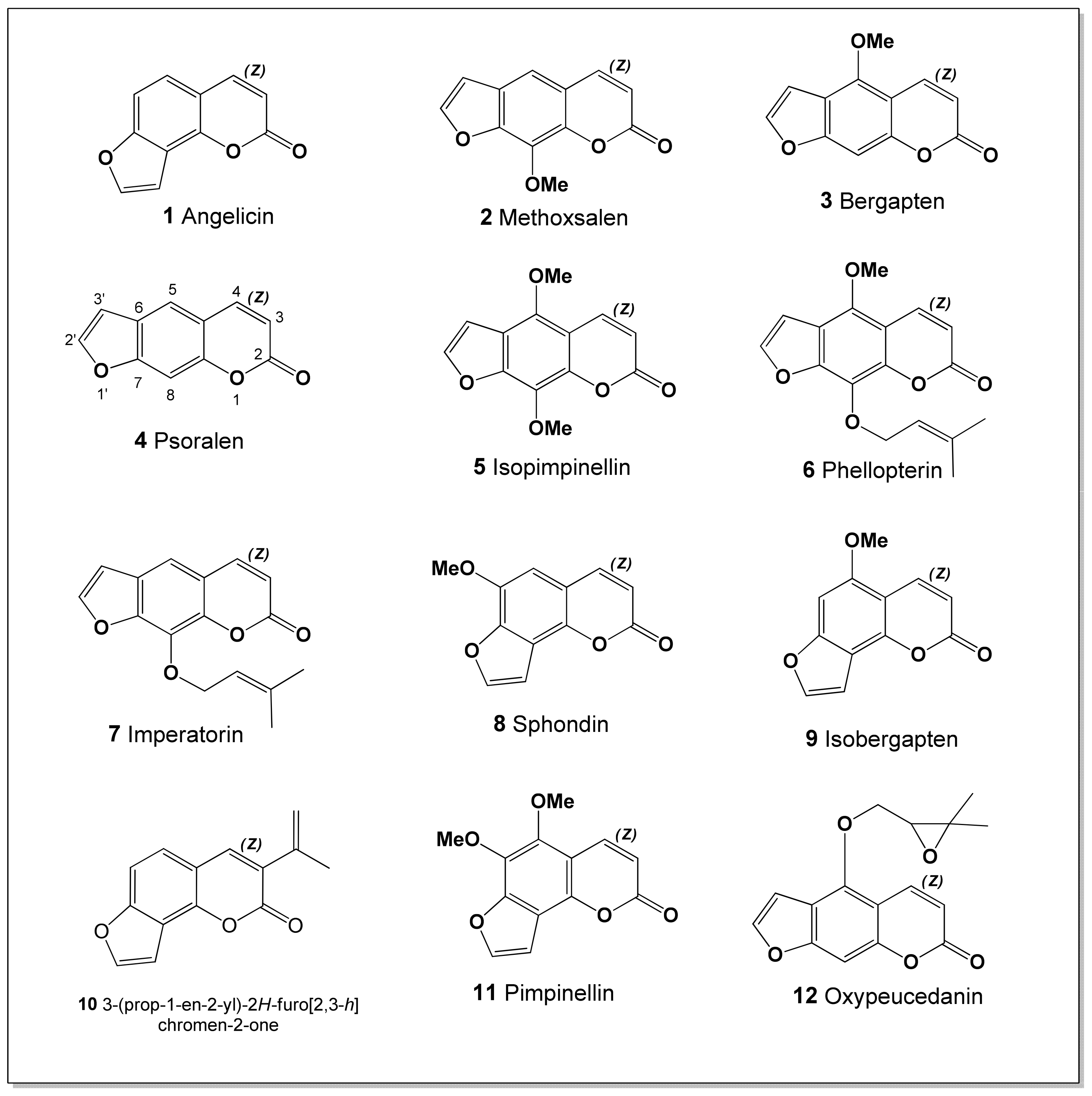 - Bruni, R.; Barreca, D.; Protti, M.; Brighenti, V.; Righetti, L.; Anceschi, L.; Mercolini, L.; Benvenuti, S.; Gattuso, G.; Pellati, F. Botanical sources, chemistry, analysis, and biological activity of furanocoumarins of pharmaceutical interest. Molecules 2019, 24, 2163. [Google Scholar] [CrossRef]