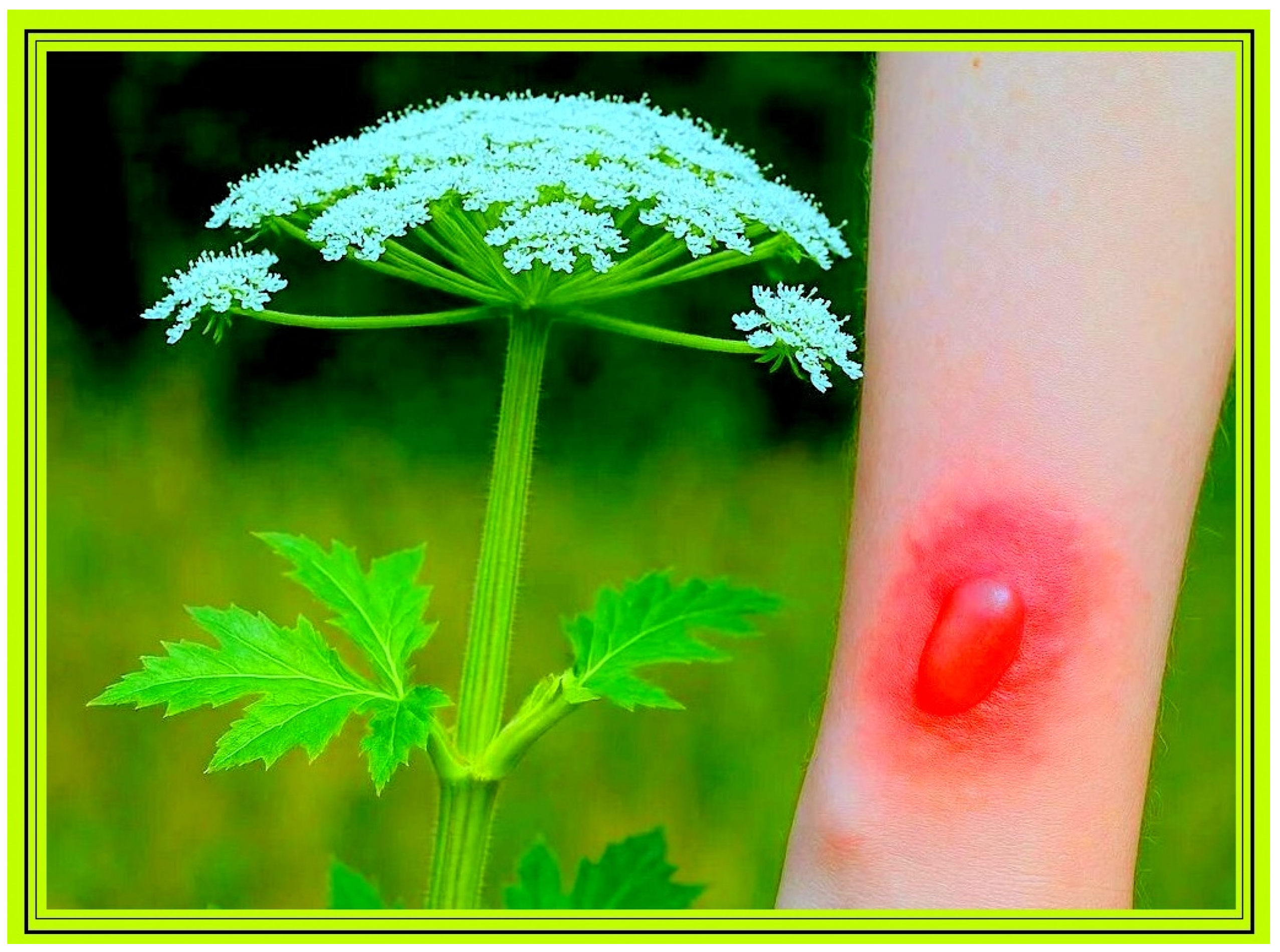 - Baker, B.G.; Bedford, J.; Kanitkar, S. Keeping pace with the media; Giant Hogweed burns—A case series and comprehensive review. Burns 2017, 43, 933–938. [Google Scholar] [CrossRef] [PubMed]