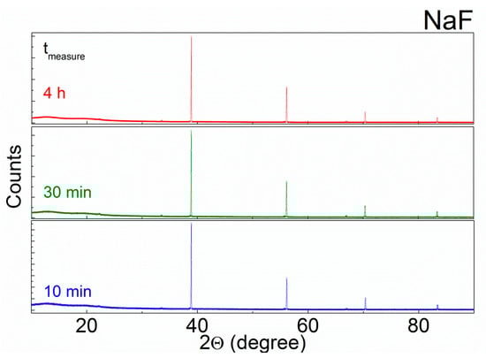 A Brucker AXS XRD D8 ADVANCE instrument was used for qualitative powder diffraction analysis to assess the purity of the end-members (as discussed above) and phases in equilibrium of selected pseudo-ternary samples. All XRD measurements were performed at room temperature. Prior to XRD measurements all samples were embedded in an epoxy glue (Hardmann Double Bubble Red Non Sag 04001 type), which is inert to samples, to protect the sample from O2 and H2O absorption from the ambient atmosphere. The absence of interaction of the analyte with the matrix was confirmed using the NaF precursor with three consecutive tests, performed at 10 min, 30 min, and 4 h of total measurement time. No changes in the spectrum with prolonged X-ray irradiation time were visible, which indicates the stability of the prepared sample, as shown in Figure 1. XRD measurements were performed in a glove box under nitrogen atmosphere (<2 ppm O2 and H2O).
