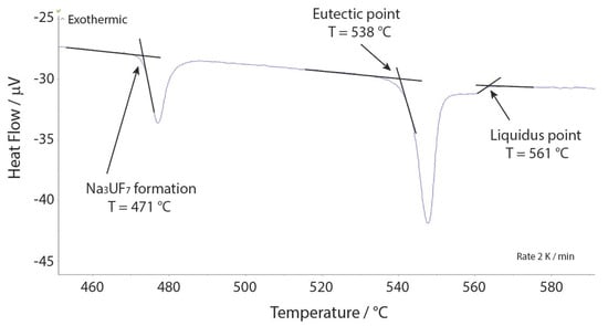 A DSC analysis of the phase equilibria determination of the selected NaF-KF-UF4 (52.3-18.7-29.0 mol%) composition.