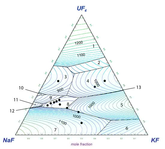 A first study of the NaF-KF-UF4 system was presented by Thoma et al. [17] based on unpublished thermal analysis data from the period 1950–1958. From their data, the authors derived a preliminary phase diagram but stated that they could not list invariant points because their data did not define the phase relationships [17].