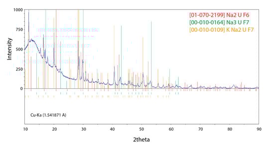 XRD pattern of the NaF-KF-UF4 (52.3-18.7-29.0 mol%) pseudo-ternary mixture measured after the DSC experiment. Qualitative analysis was performed using Match software and PDF2 database to define the nature of phases present in the sample [20,21].