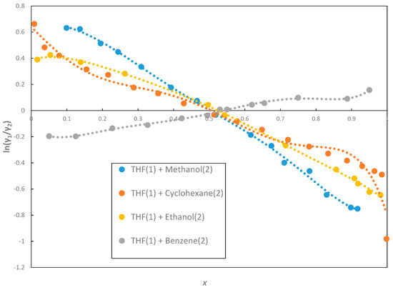 The experimental isothermal VLE data [12,13] and the predicted data for the binary system of THF(1) + Benzene(2) and THF(1) + Cyclohexane(2) at 303.15 and 333.15 K, respectively, isobaric VLE Data [14,15], and the predicted THF(1) + Methanol(2) and THF(1) + Ethanol(2) at 103 kPa were correlated by Wilson, NRTL, UNIQUAC, and UNIFAC models. Using the Herington test, the best thermodynamic consistency for the VLE data was found for the THF(1) + Cyclohexane(2) isothermal system and the THF(1) + Ethanol(2) isobaric system. The RMSDPi and RMSDyi show that the UNIQUAC model for isothermal systems THF(1) + Benzene(2) and THF(1) + Cyclohexane(2) and the NRTL model for the isobaric systems THF(1) + Methanol(2) and UNIQUAC model for THF(1) + Ethanol(2) perform better than the other models. Probably, as previously proposed, the non-equilibrium state between phases in the VLE is focused around the variations of vapor flow quality, entropy generation, and exergy variation [26]. The analysis of the phase equilibrium in magnetorheological fluids could be a second research opportunity for non-equilibrium systems [27,28].
