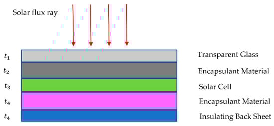 Figure 1 presents the simplified layered structure of the PV module. Each layer has a particular thickness, and there is a material property for the coating that enhances heat transfer conduction between layers. The solar flux during the day changes orientation. At midday, the Sun is assumed to radiate perpendicularly to the PV module, which has a 90° exposure to ground level. For the rest of the day, the module has a greater or smaller solar radiation intercept. Hence, the absorbed solar flux must consider the perpendicular component of the PV module and the radiation absorbed during the daytime.