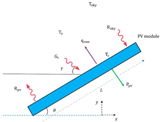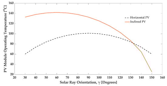 The figure clarifies the significant distinction regarding convection heat transfer on an inclined panel and a flat panel. This figure illustrates how the horizontal PV module has more convection heat transfer. It causes the PV module not to gain the maximum solar flux and means that it will have a lower operating temperature. Moreover, this behavior explains why the literature looks for an optimal tilt angle for a PV module which, with that angle, could receive significant solar flux and generate higher temperatures [2,26,27,28,29,62,63,64,65,66,67].
