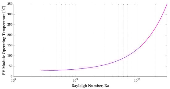 Figure 3 illustrates the flat PV module temperature change with the Rayleigh number. In this figure, the module has a tilt angle , and sunrays at . The Rayleigh number function of ambient temperature, , difference per module operating temperature is . In this figure, the ambient temperature is assumed to be constant; therefore, the airflow properties are stable [16,33]. The Rayleigh number increased logarithmically as the operating module temperature increased. When the module operating temperature was under 50 °C, the Rayleigh number increased slowly; however, after 50 °C, it gained a sharp curve slope. This figure presents the PV module operating temperature at 300 °C. However, the operating temperature in the application has a peak efficiency for PV modules at 15 to 35 °C, and the maximum measured PV module temperature is 65 °C [30,41]. The Rayleigh number is seen in this domain as less than 1011, validating Equation (10) for the application of a flat PV module.