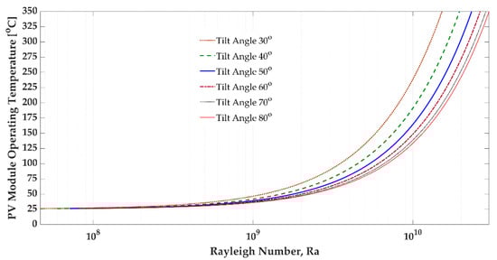 In Figure 4, the inclined PV module temperature is presented in terms of a logarithmically changing Rayleigh number. The angle of solar incidence is assumed to be . The PV module tilt angle is varied within . This figure shows that when the operating temperature is under 50 °C, the Rayleigh number moderately increases for all tilt angles. However, for PV module temperatures higher than 50 °C, the Rayleigh number increases dramatically. According to the literature, the maximum PV module temperature is 65 °C [30,41].